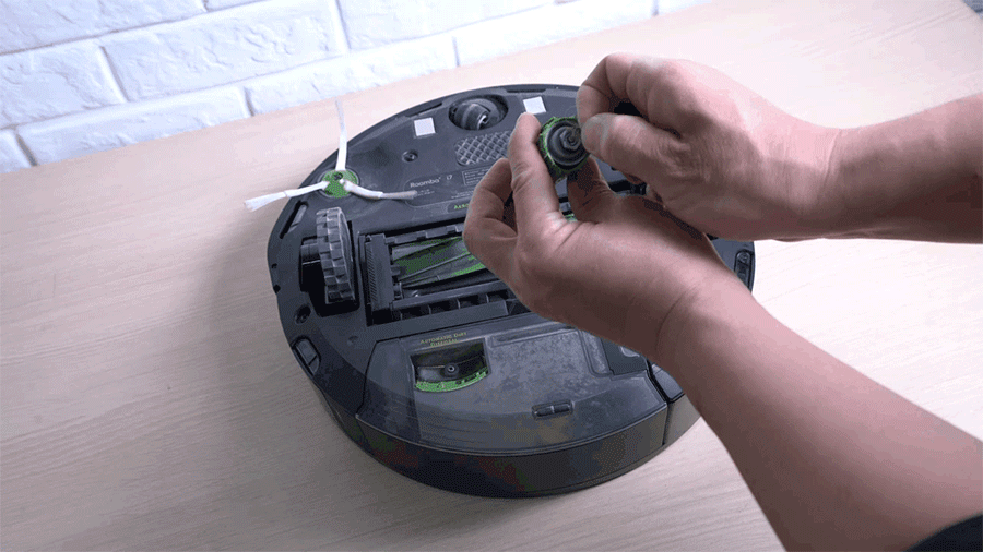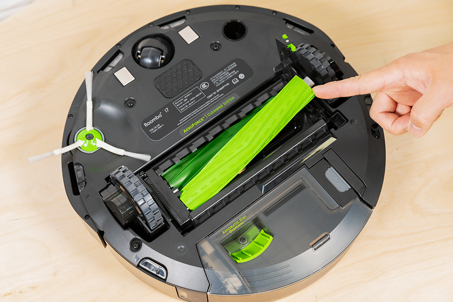 iRobot i7+機身的底部和上一代的9系列相比有進一步的升級,搭載了進階版三重高效清潔系統,尤其在膠刷的升級最為明顯,此前9系列的雙膠組合是棕色和黑色,而iRobot i7+則將它們都替換成了環保的綠色。