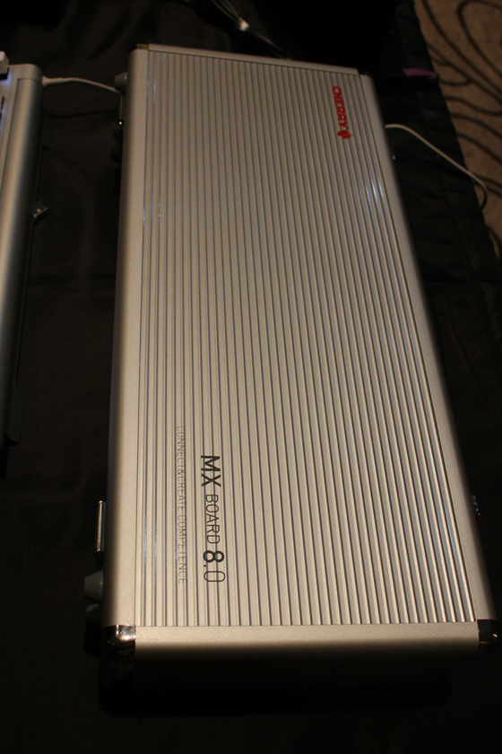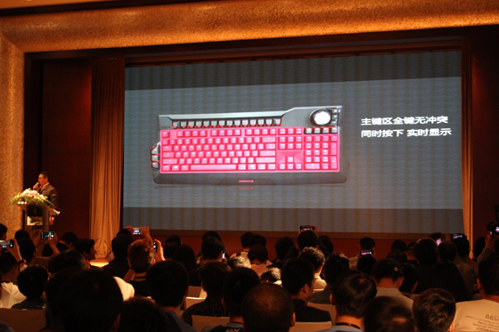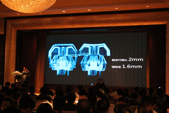 CHERRY德國市場總監Michael因為工作檔期不能抵滬,為大家帶來一個新的驚喜,視頻播放后給全場參會者帶來不小的轟動,CHERRY MX BOARD 8.0(以下簡稱8.0)。CHERRY 8.0有三大特點,百分之八十精簡布局,省掉了小鍵盤;全鍵盤鋁制機身,CNC陽極氧化處理;鋁制銀色軍火箱。除此之外,側邊CD紋理,卷軸旋轉式支架設計讓人眼前一亮。懸浮式上蓋,全鍵無沖,白色背光,細膩的二色透光鍵帽,宏按鍵和驅動軟件等功能應有盡有。CHERRY MX黑、青、茶、紅四種軸體可選,零售價為1499元,發布會后預約發售。