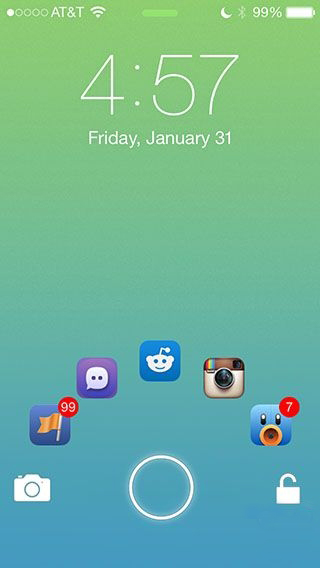 JellyLock為iOS的鎖屏界面增加了一個圓圈,通過不同方向的滑動可以預先設置解鎖、打開相機或者自定義的應用(至多6個)。