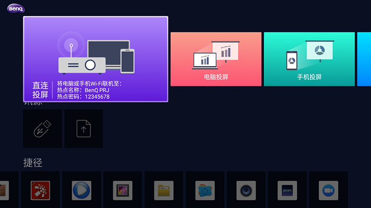 可有了明基智能商務投影儀就不一樣,它支持無線投屏,無論你用的是iPhone還是Android手機,電腦上運行的是Windows還是macOS,都可通過Wi-Fi網(wǎng)絡一鍵投屏到投影儀上,與會人員不再根據(jù)投影儀數(shù)據(jù)長度就坐。如果辦公室沒有Wi-Fi網(wǎng)絡或是網(wǎng)絡信號不佳,可使用明基智能商務投影儀創(chuàng)建Wi-Fi網(wǎng)絡,讓手機、電腦直連投影儀投屏,使用起來十分方便。