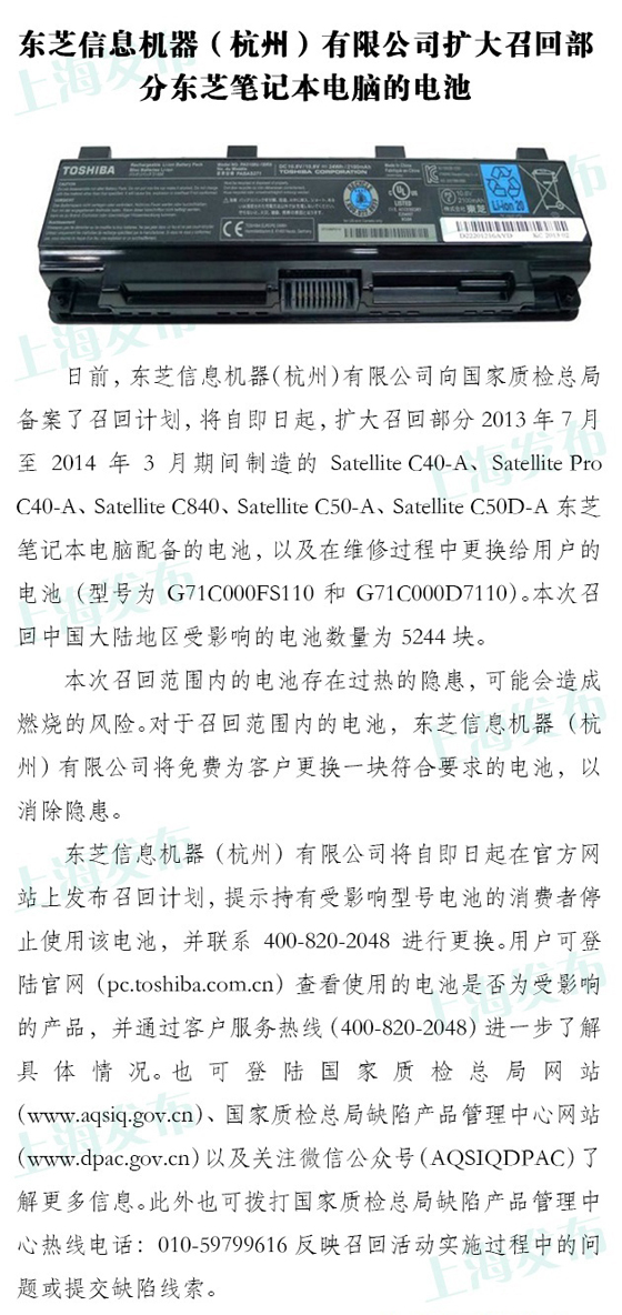 繼各家手機(jī)廠商電池接連出問(wèn)題后,如今筆記本電腦電池也發(fā)生了問(wèn)題。據(jù)國(guó)家質(zhì)檢總局消息,東芝信息機(jī)器(杭州)有限公司自即日起召回2013.7-2014.3制造的多款型號(hào)的東芝筆記本電腦配備的電池,以及在維修過(guò)程中更換給用戶的電池。