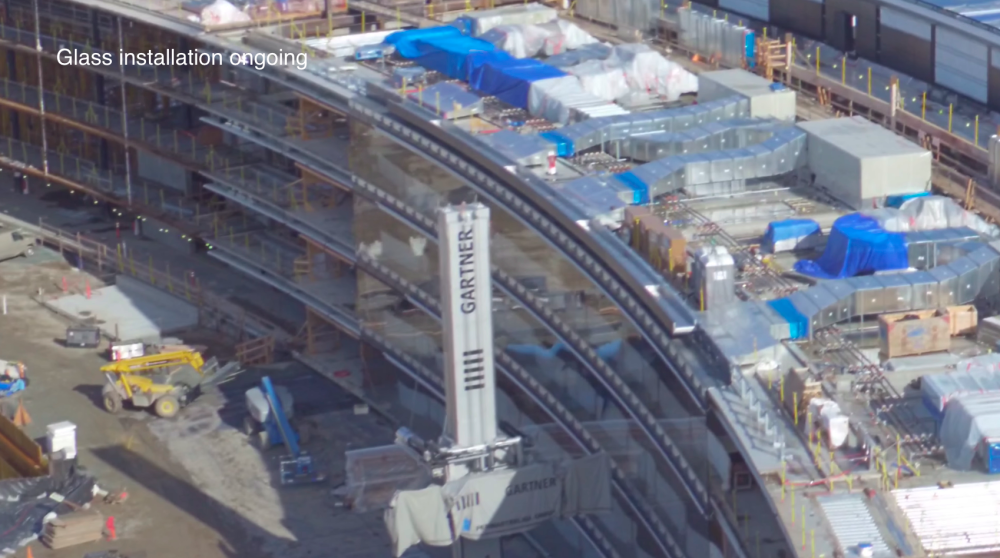 可以看到蘋果園區的外墻基本已經建造完畢,在視頻的45秒左右顯示接下來蘋果將會裝配外墻玻璃和屋頂玻璃,根據計劃,在完成主建筑的幾個月后,蘋果將會全面覆蓋,為所有建筑裝配玻璃。