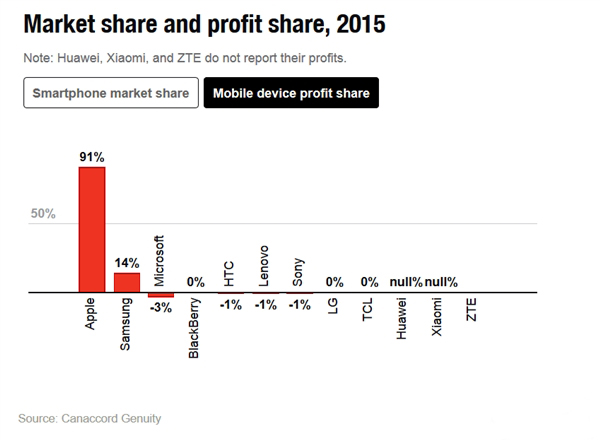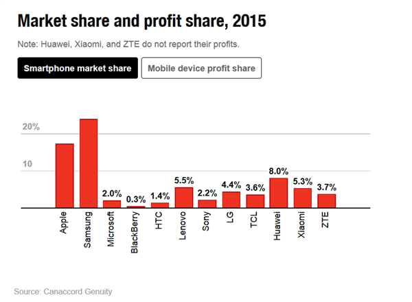 不過(guò)對(duì)于廠商而言,利潤(rùn)率才是它們最關(guān)心的。三星的利潤(rùn)占比為14%,而其它廠商如HTC、微軟、索尼、聯(lián)想等廠商手機(jī)業(yè)務(wù)都是處于虧損狀態(tài)。也就說(shuō),2015年只有蘋果和三星手機(jī)業(yè)務(wù)實(shí)現(xiàn)了盈利,而其它廠商基本處于“賠錢賺吆喝”的尷尬境地。