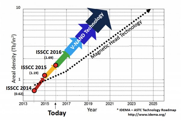 當然HDD技術并沒有停滯不前,不過和SSD比起來就是小巫見大巫了。日前在ISSCC 2016會議上,Coughlin Associates公司總裁Tom Coughlin就公布了一份研究報告。這份報告顯示:SSD硬盤的發展速度相比HDD機械硬盤快得驚人。存儲密度從1.19Tbpsi提升到1.69Tbpsi,美光還公布了容量為768GB的TLC 3D閃存,存儲密度達到了2.77Tbpsi,遠超HDD硬盤水平,而這只是技術的剛剛開始,未來SSD的存儲密度到底能達到多少,上不封頂。