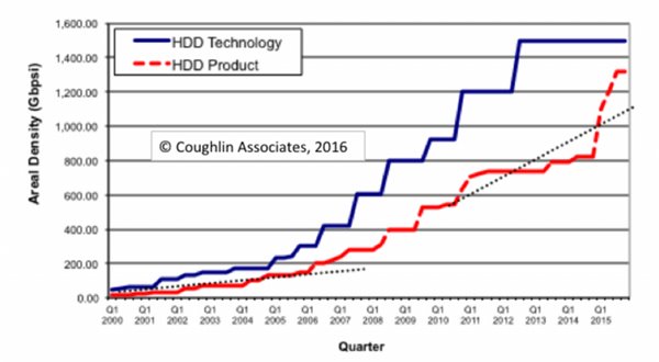 別看現在HDD的容量還是占據著優勢,不過HDD技術先天的缺陷決定了它的好日子很快就會到頭。因為HDD硬盤使用的是磁盤,保持體積不變的情況下,要繼續提高容量就只能靠提升磁盤存儲密度這一條路了,這項技術的指標單位是Tbpsi。不過存儲密度可不是想提升就提升的,目前技術已經到了瓶頸,技術已經基本到頭了。