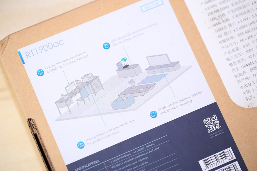 包裝盒的背面有群暉RT1900ac無線路由器的詳細參數,雙核1.0GHz的處理器,搭載256MB DDR3內存,支持802.11ac無線傳輸與2.4/5GHz同步雙頻段傳輸,速度總和高達1900Mbps
