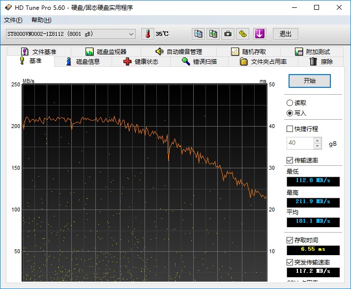 接著我們來測試硬盤性能,為了保證數(shù)據(jù)的可靠性,我們先把硬盤放在機箱里測試硬盤的速寫速度。