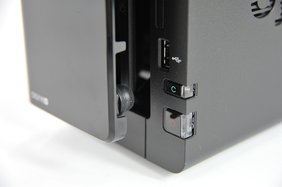 正面有一個USB3.0接口和一鍵復制按鈕,就是接上USB設備后按一下C鍵就可以直接把數據復制到NAS里(注意那個SD卡槽是不能打開的)