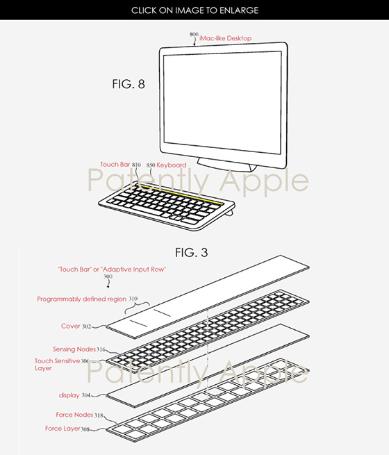 近期,美國專利商標局在上周四公布了蘋果公司的六項專利申請,涵蓋了MacBook的新型觸控板。這些專利還描述了一種用于iMac鍵盤的Touch Bar,從專利圖上我們可以看出這應該就是下一代Magic Keyboard。