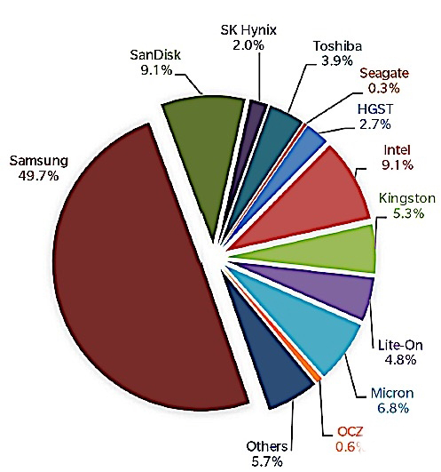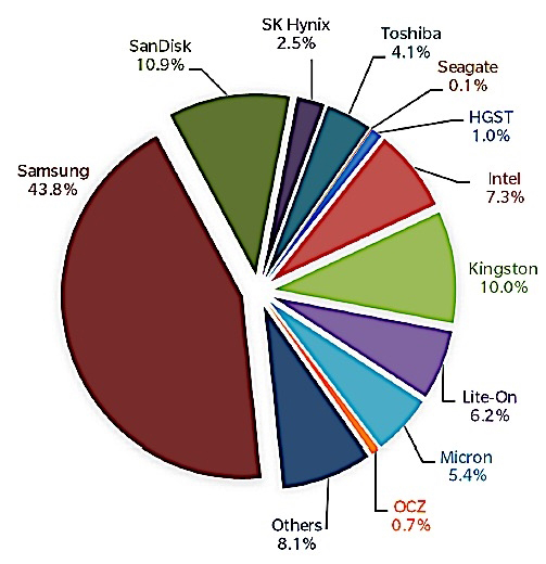 根據該調查可以看出,三星在市占率方面拔得頭籌,份額達到了43.8%,可以說是憑一己之力統治市場,第二名的是閃迪,只有10.9%,接下來是金士頓10.0%。