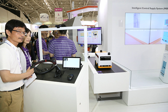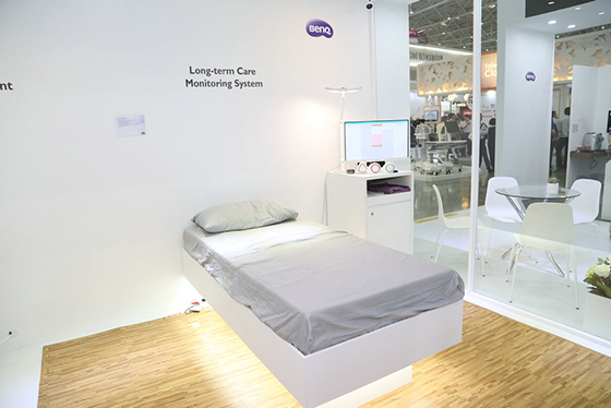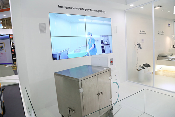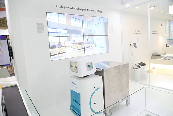 考慮到中國的老齡化社會以及醫護人員面臨短缺危機這兩個因素,BenQ推出了高效的智慧醫療解決方案。現場展示了智慧床墊、醫療運輸機器人(MiBot),醫療運輸機器人目前已進入部分醫院,它能夠安全高效的運送手術房的臟污物品,有效減少醫院人力資源的占用問題。