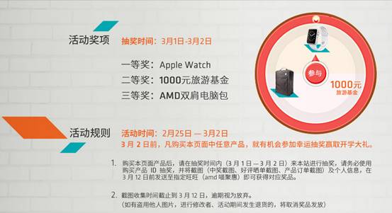 在3月2日前,購買AMD天貓品牌站開學季頁面產品后,在抽獎時間(3月1日-3月2日)到AMD天貓品牌站使用購買產品的ID參加抽獎。并在3月12日之前將截圖(中獎截圖、好評曬單截圖、產品訂單截圖)及個人信息發送到AMD指定旺旺賬號(amd喵聚惠)即可獲得對應獎品。抽獎詳情請持續關注AMD天貓品牌站。