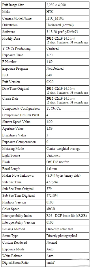 日前外媒TechTastic曝光了一張疑似HTC M10的拍照樣張,還附帶一張EXIF信息圖,表現讓所有人大失所望,效果極其失敗,可謂一塌糊涂。