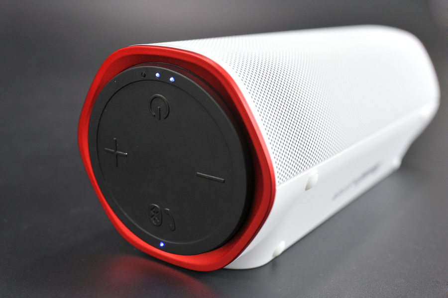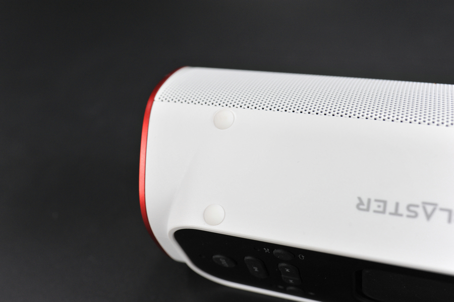 FRee的機身外觀大多采用了磨砂質感的外殼,兩處“Sound Blaster ”logo也十分顯眼,其中一處也設有橫臥的橡膠支腳,以便安放。兩側則是橡膠材質,一側為電源鍵、音量鍵和藍牙(通話接聽)按鍵而在電源鍵以及藍牙鍵都附有提示燈以便提示電源情況以及藍牙連接情況,一側則僅有創新logo(可直立放置,采用橡膠材質應該是增加摩擦力)。