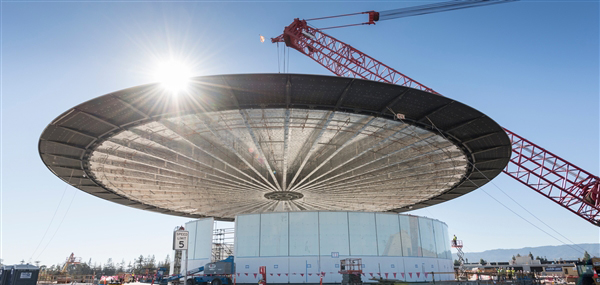 圖中展示了施工方吊頂的過程,屋頂采用的是碳纖維材質,同時還融合了鋼鋁。蘋果表示,屋頂是在迪拜設計和組裝完成然后運回美國,重達80噸,直徑45米左右,是同類建筑模塊中最大的。