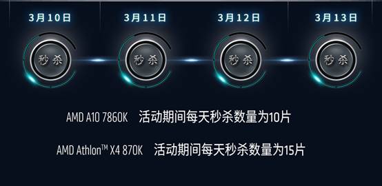 據悉,從3月10日至3月13日活動期間,AMD每天將提供給消費者限量秒殺10片AMD A10 7860K以及15片AMD Athlon X4 870K的機會。原價799元的AMD A10 7860K秒殺價僅499元,而AMD Athlon X4 870K秒殺價格更是低至299元!數量有限,先秒先得。