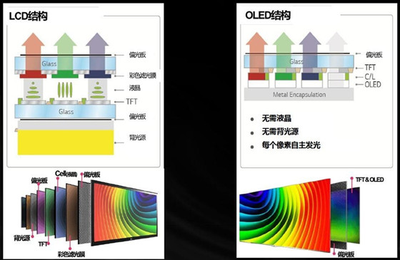 已知平面顯示器的核心是用TFT來做像素控制,OLED呢是直接一對一的放在TFT上,OLED等于像素,所以叫做自發光。LCD與LED則是使用背光源,然后使用偏光板、液晶等來做遮擋,達到顯示圖像的目的。(LCD與LED的背光源不同)