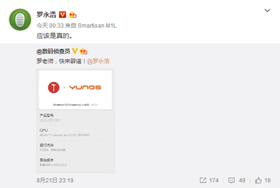 以往老羅在回復可疑的信息的時候,如果是假的,都會直截了當地說“假的”,但此次老羅竟然罕見地給出了正面的回答:應該是真的。這樣的回答,基本已經將這個爆料坐實。而老羅正面回應如此大膽的曝光,或許意味著這個產品將很快與大家見面。