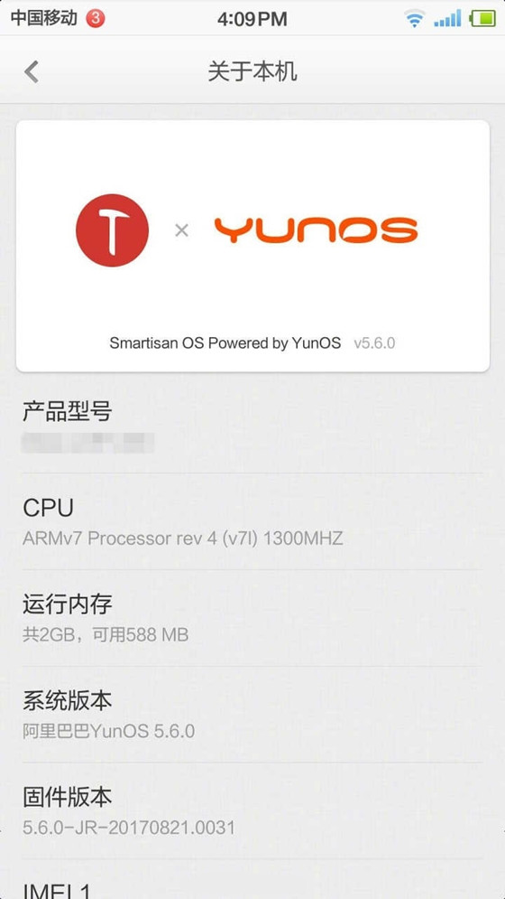 在曝光圖中得到的信息顯示,這臺手機運行的Smartisan OS基于YunOS v5.6.0版本打造,但整機的配置卻并不高,CPU主頻1.3GHz,內存為2GB。有人猜測,錘子可能會像魅藍一樣,會首先在千元機產品線上用上YunOS系統。