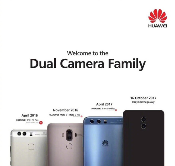 第一張圖中配有文字“Welcome to the Dual Camera Family”暗喻“歡迎(三星)加入雙攝大家庭”,并在圖中列出了華為的雙攝旗艦家族,包括P9丨P9 Plus、Mate 9丨Mate 9 Pro、P10丨P10 Plus以及一款將于今年10月16日發布的手機,并在標注名字的區域赫然寫著“beyondthegalaxy”(可以理解為:超越三星Galaxy系列),而這款手機基本確定為華為將要發布的Mate 10。