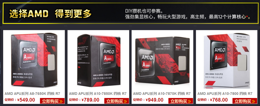 本次“你裝機我出錢,2016集顯電腦爭霸賽”活動,AMD已經為用戶們備齊了多款基于AMD APU平臺的組裝電腦以及UPC,用戶可直接選擇購買這些整機輕松參與本次有獎曬單活動。此外,數款不同定位AMD APU讓DIY用戶更可以有針對性的選購,根據經驗組建DIY集顯電腦躋身排名前列,摘取豐厚獎勵。