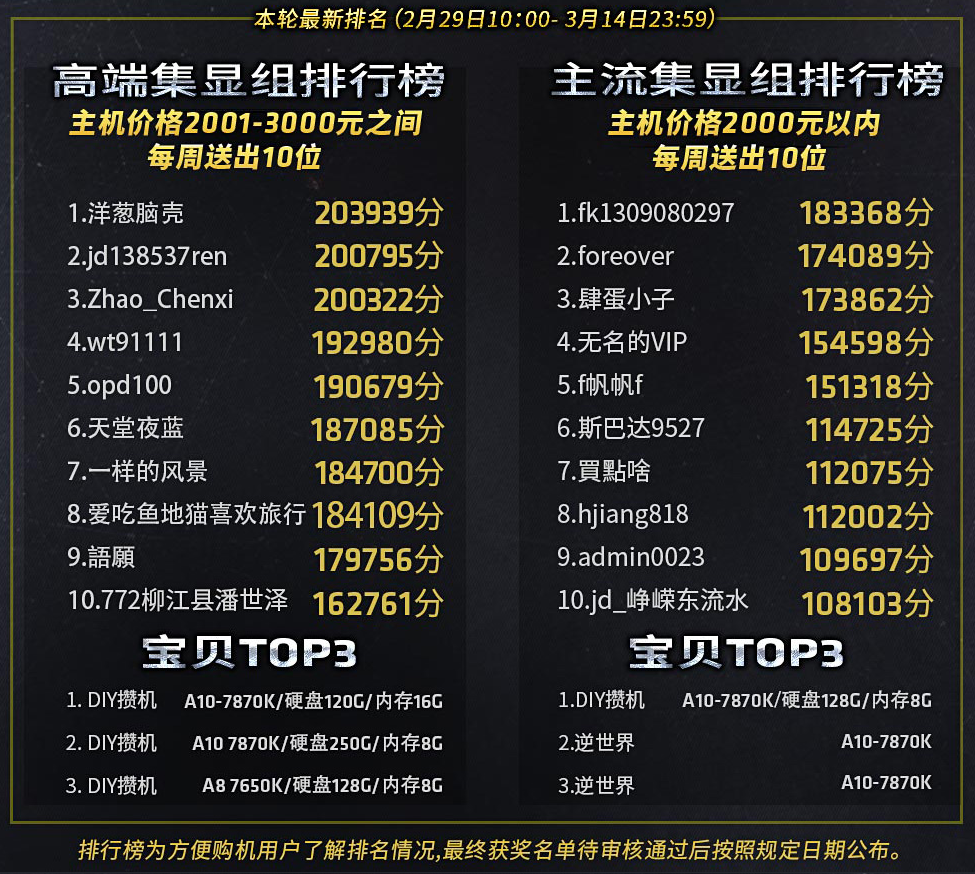 進入3月以來,由AMD與京東商城聯合為諸位玩家舉辦的“你裝機我出錢 2016集顯電腦爭霸賽”活動正在京東3C電腦節上如火如荼的展開著。目前第一階段比拼即將結束,高端集顯組和主流集顯組TOP10不斷被各路豪強玩家刷新!曬單社區活動帖瀏覽量高達7萬6千余次,回復參與者接近400人,可見諸位玩家對于此次活動的參與熱情出奇高漲。