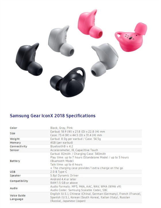 Gear IconX 2018擁有黑、白、粉紅三種配色,重量8g,充電盒54.5g,每個耳塞擁有4GB ROM存儲空間,支持藍牙4.2,電量方面耳塞擁有82mAh電池,可充電收納盒擁有340mAh電池,脫機模式播放音樂續航7小時,藍牙連接模式播放音樂續航5小時,通話續航7小時。同時,耳機機身支持觸控操作,可調節音量或切換歌曲,同時還擁有心率傳感器、運動追蹤,佩戴即開啟。