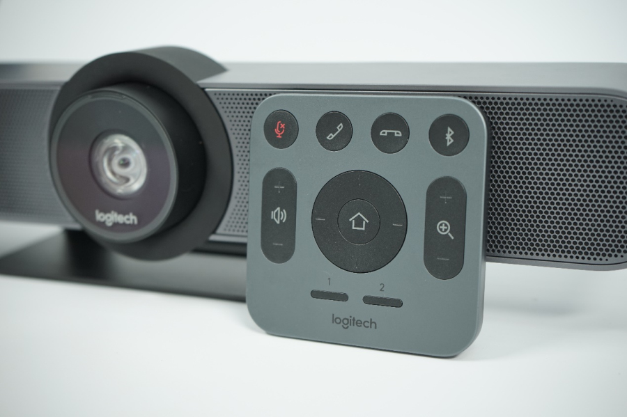 羅技CC4000e標(biāo)配一個(gè)遙控器,可以無線控制攝像頭進(jìn)行轉(zhuǎn)動(dòng)、畫面縮放、聲音大小、兩個(gè)預(yù)設(shè)位置、接通和掛斷通話(需軟件支持)、快捷關(guān)閉麥克風(fēng)以及打開藍(lán)牙操作。