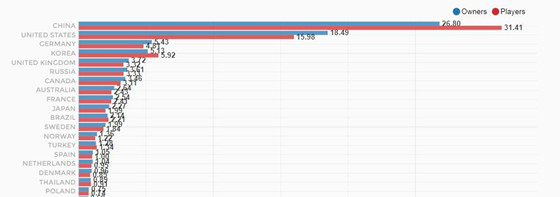 據SteamSpy最新的統計數據,中國地區的銷量排行已經登頂,以26.80%的銷量占比,近300萬份的數量處于絕對的領先地位,玩家數量更是以31.41%的比例穩居第一,無論是銷量還是玩家數量都大幅領先排第二的美國。