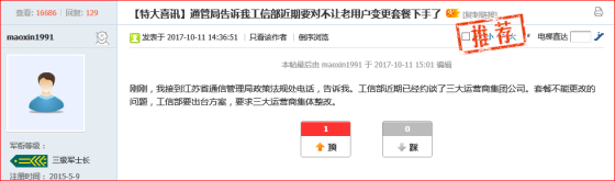 或許是接到的投訴量明顯增多,這一問題引起了工信部的重視,近日有用戶發(fā)帖稱,在進(jìn)行投訴后,接到了江蘇省通信管理局政策法規(guī)處的電話,并透露出信息:工信部近期已經(jīng)約談了三大運(yùn)營商集團(tuán)公司,套餐不能更改的問題,工信部要出臺方案,要求三大運(yùn)營商集體整改。
