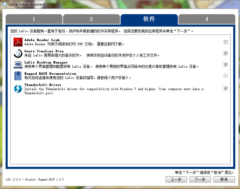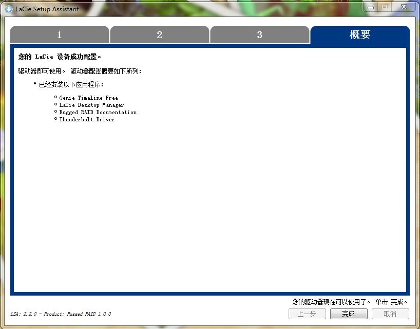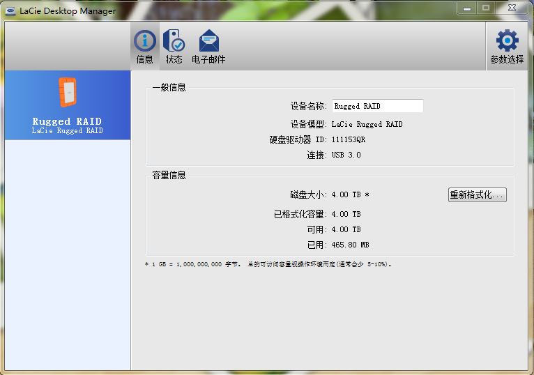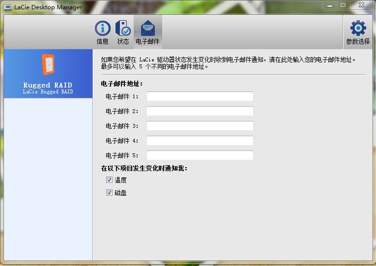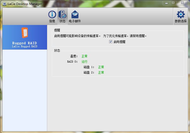 LaCie Rugged RAID作為定位于高端的存儲產品,LaCie還為其配置了軟件,在第一次使用的時候需要安裝,小編是在Windows平臺安裝了此驅動器。該軟件主要可以查看硬盤的事實狀態,如提醒是否溫度過高、工作是否正常等。