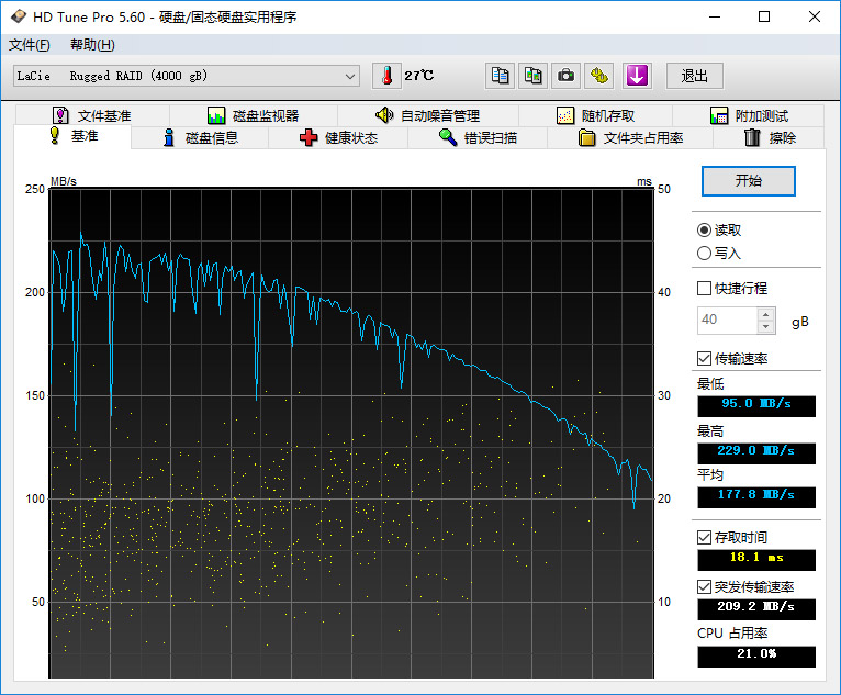 通過測試我們發現,這款Rugged RAID的最低讀取速度為95MB/s,而最高讀取速度為229MB/s,平均速度為177.8MB/s,測試的曲線相對變化不大。