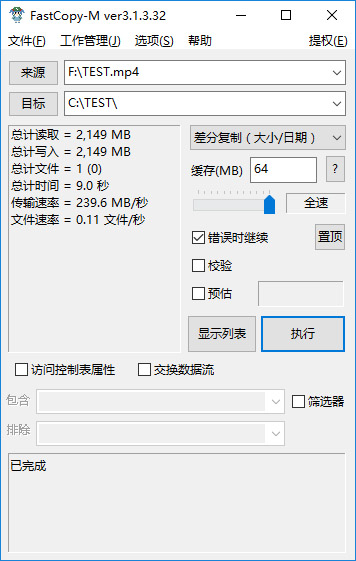 我們采用FastCopy來模擬真實讀寫操作,測試存儲設備的真實讀寫速度。通過對2G文件進行復制寫入速度212.3MB/s,用時10.1秒。而從移動硬盤讀取出文件的速度為239.6MB/s,綜合讀寫速度相當迅速,屬于理想水平。