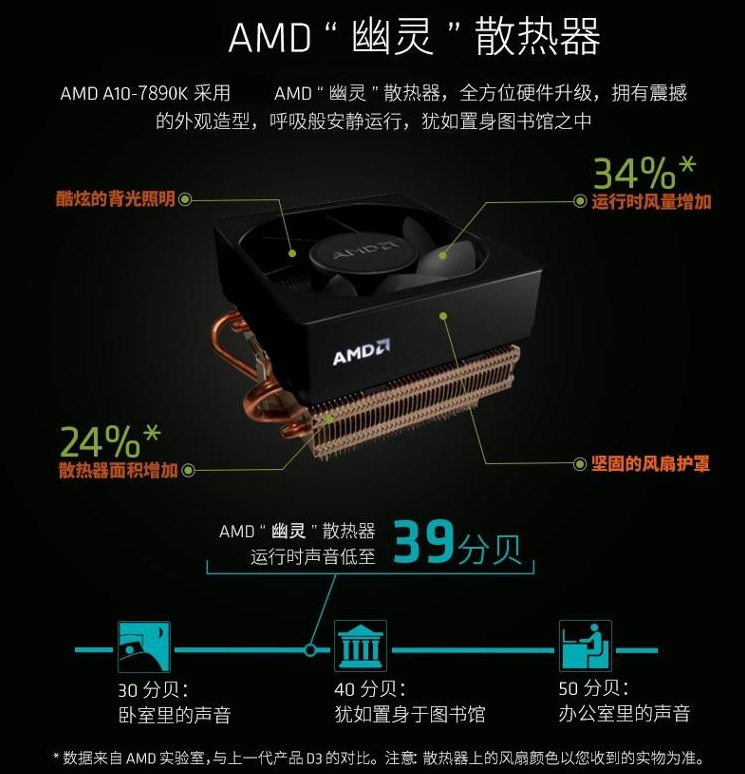 幽靈散熱器基于全方位硬件升級理念打造,風量增加34%、散熱面積增加24%并且搭配了高效雙熱管,最低運行噪音僅為39分貝,讓您體會高性能與靜音的雙重享受。同時,A10-7890K依舊具備手動超頻和自動超頻功能,喜愛超頻的玩家可以借助幽靈散熱器的高效性能進一步“壓榨”A10-7890K的極限,從而全面提升平臺的整體性能。