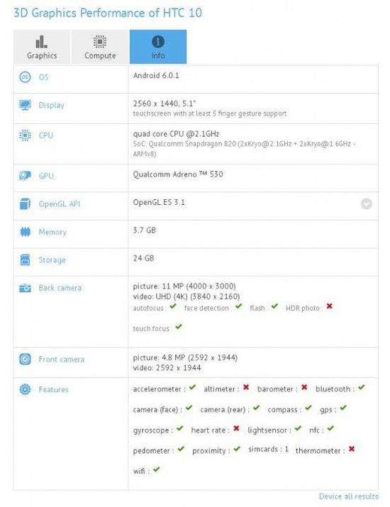 現在,關于HTC M10的完整配置已經出現在GFXbench中,數據顯示,HTC M10的屏幕大小為5.1英寸,2K的分辨率,搭載高通驍龍820處理器,GPU則是高通的Adreno 530,4GB的運存和32GB的內存。前置500萬,后置1200萬像素的攝像頭,同時支持4K視頻拍攝。