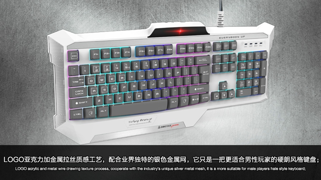 LOGO亞克力加金屬拉絲質(zhì)感工藝,配合業(yè)界獨(dú)特的銀色金屬網(wǎng),它只是一把更適合男性玩家的硬朗風(fēng)格鍵盤;