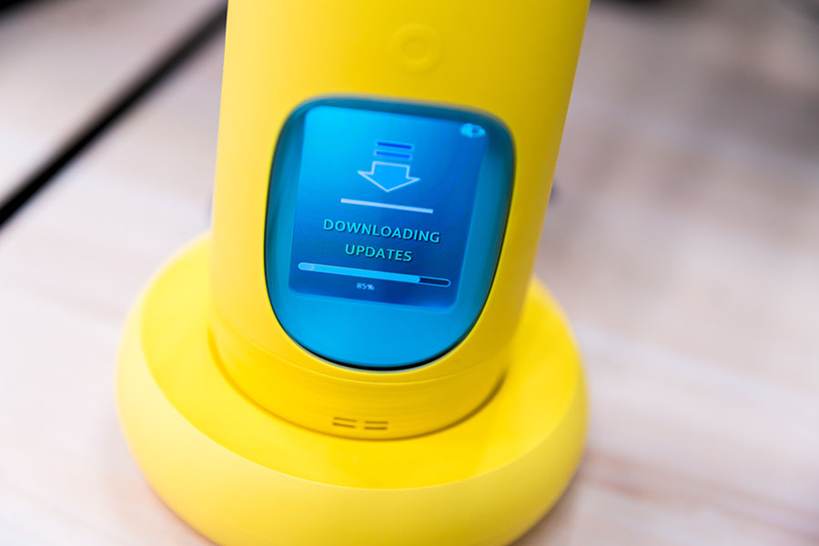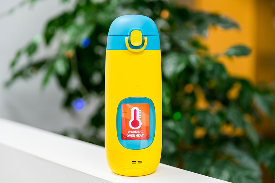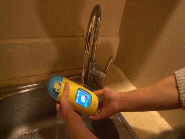 給小孩子飲水,水溫的溫度也同樣重要,如果水溫過高孩子飲水會燙傷,且不利于食道咽喉管的健康,所以Gululu水杯內還加入了溫度傳感器,倒入超過50度的熱水,屏幕會有高溫提示,等熱水降溫屏幕警告解除后飲水。