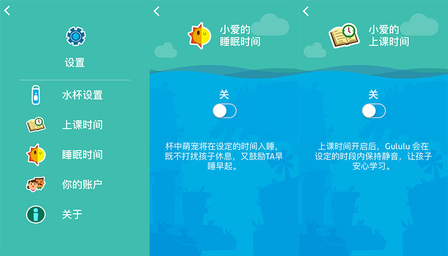 在引導小孩子合理飲水的方法上,循循善誘往往比強硬的說教方式更有效果,Gululu研發團隊設計出的這一套完整的故事體系,引導孩子在養成飲水良好習慣的同時富有愛心和責任感。并且,家長通過手機App的數據可以實時了解到孩子的飲水情況。飲水量的數據同步到手機端App會稍有延遲,另外App里還會根據小孩的飲水量給小孩的飲水習慣打分。