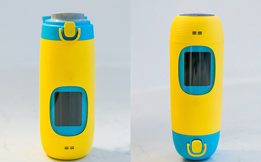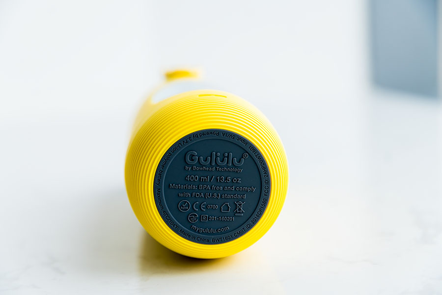 Gululu是一款適用于3-10歲年齡的兒童智能水杯,一共有海洋藍、珊瑚粉、潛水艇黃三種顏色款式提供選擇,我們這次評測拿到的是潛水艇黃色款,水杯有400ml儲水容量,水杯外部整體采用軟膠材質,杯蓋采用的是按鈕彈出的設計,單手操作相當的方便,扣上安全扣之后將水杯倒放,也沒有發生漏水現象,密封性能良好。
