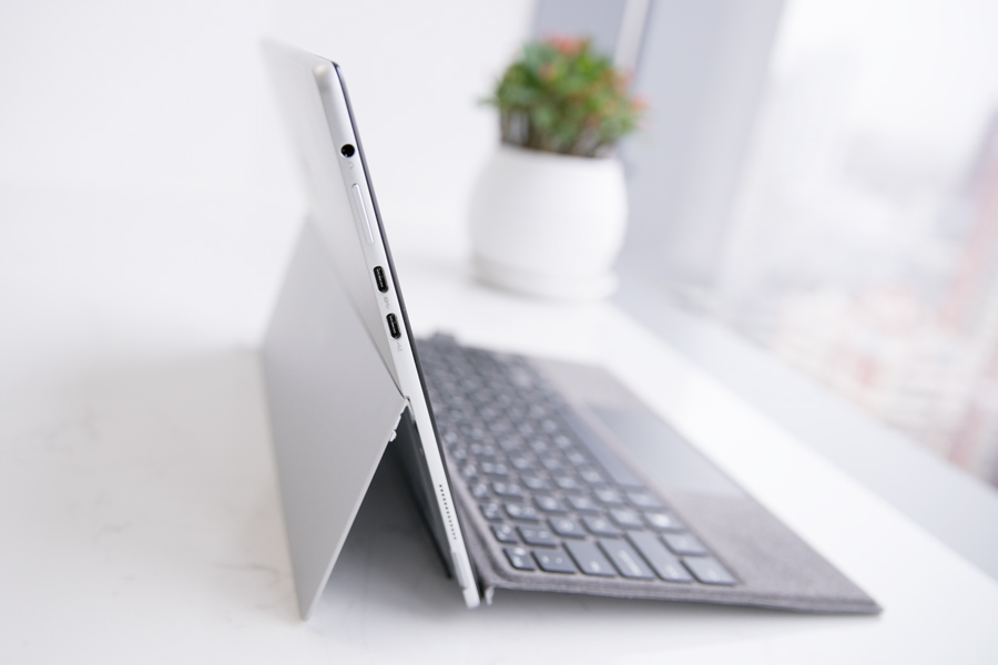 機身左側從上到下分別為3.5mm耳機接口、音量鍵、兩個USB 3.1 Gen1 Type-C連接口、左揚聲器、便于打開支架的凹槽。值得注意的是,充電接口是兩個USB Type-C接口中靠下的那個,電源如果誤接入上方的接口將不會對筆記本進行充電。