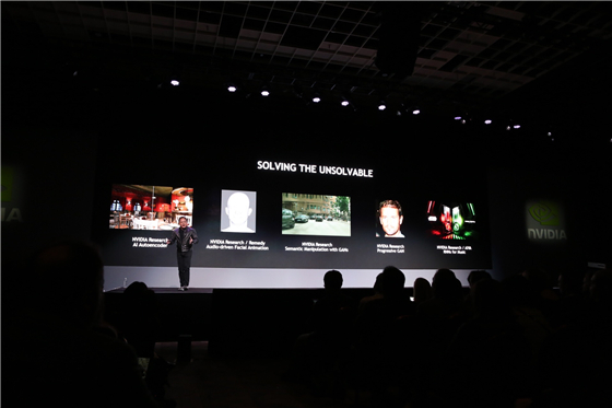 不光是自動駕駛方面,黃仁勛還介紹了Volta架構處理器,搭載著運算速度達到125 TFLOPS(每秒萬億次浮點運算)的tensor core,用于處理AI工作負載,在會上,黃仁勛還給大家演示了AI的神奇之處,比如8個Tesla V100芯片每秒可以識別7012張圖片,生成不存在的人臉,應景而作的歌曲等。