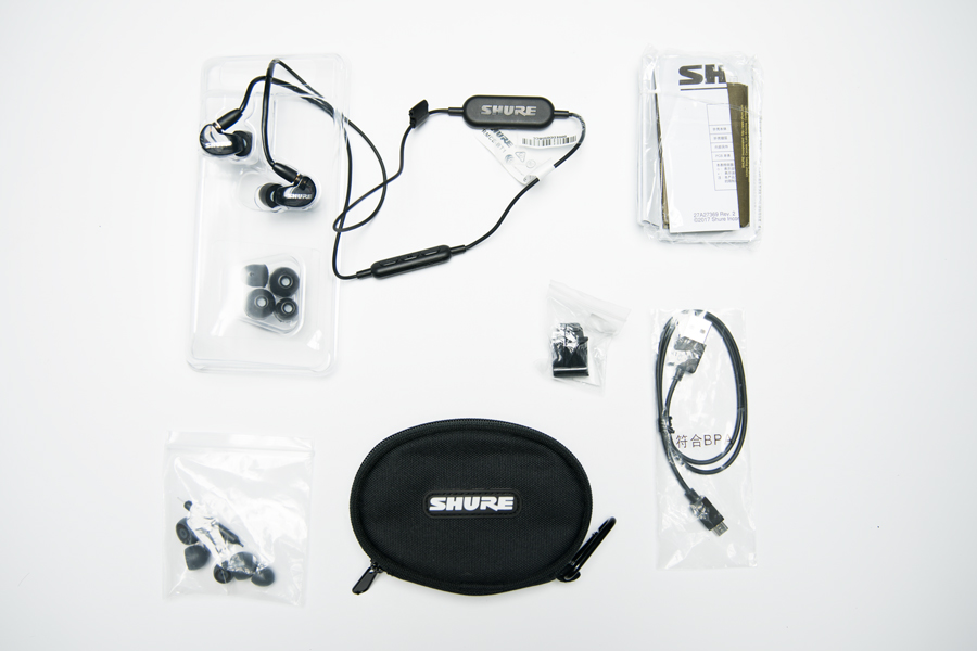 拆開包裝,除了說明書等文件外,舒爾SE215-BT1附贈了一個便攜收納包、一根Micro-USB充電線、一個線夾和硅膠、海綿兩套耳塞套,還有一個小清理棒。
