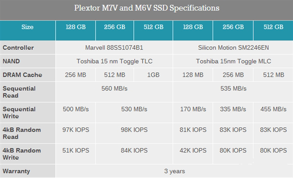 早在2015年初的CES大展上,浦科特就展示了M7V,當時配備的是Marvell 88SS1074主控、東芝A19nm TLC閃存,而一年多后的最終版采用了新版本的主控Marvell 88SS1074B1,支持基于LDPC(低密度配對校驗)的NANDEdge糾錯技術,八通道設計,閃存也升級到了東芝15nm TLC。