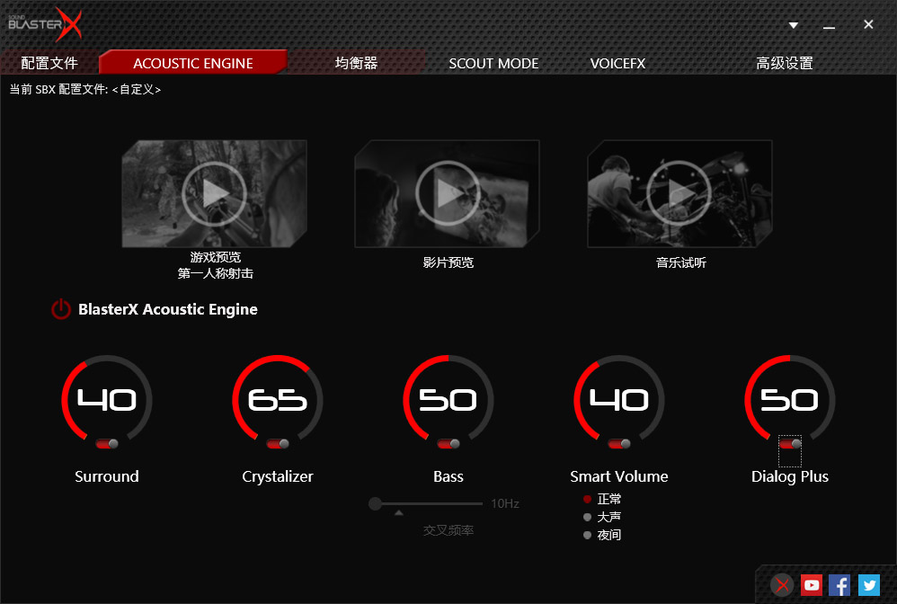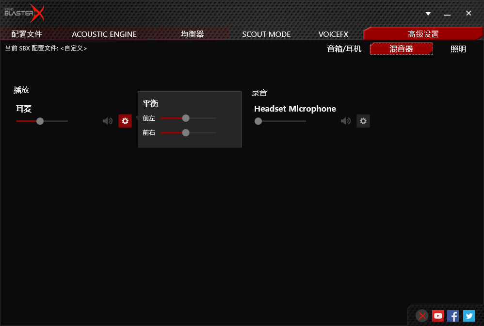 接著我們來介紹一下這款耳機的驅動程序—BlasterX Acoustic Engine Pro,和SBX不同,BlasterX Acoustic Engine Pro更注重游戲方面的優化,其預設了大量游戲的音效配置。下面我們就來介紹一下這款全新的驅動程序。