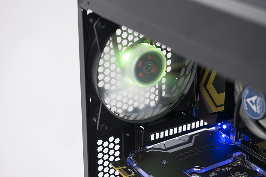 前面板風扇的變色顯示。在暗室中的效果非常鮮明,通過光影變幻能夠烘托非常具有沉浸感的游戲氛圍。而他們在燈照下的顯示效果也同樣不差。