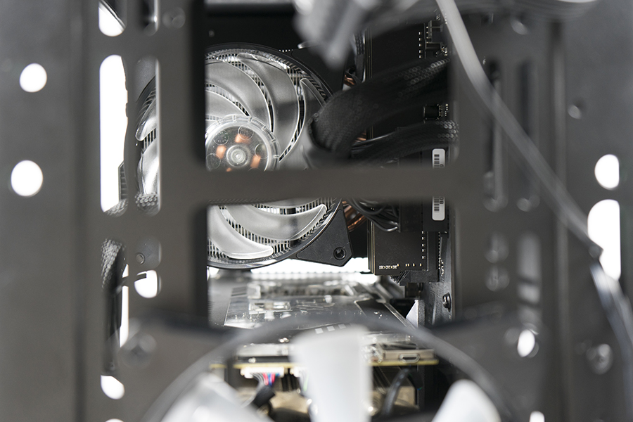 實裝效果非常完美。不但放下310mm長度的1080ti綽綽有余,2.5寸硬盤位前的空間還可以放下顯卡支撐架。在安裝前我們即使知道其散熱器限高為166mm,面對T620P的165mm大塊頭依然捏了一把汗。不過MB500的確毫無虛標,完美地塞進了這個大家伙,看來對于自家產品的兼容的確到位,對于其他品牌更是不在話下。