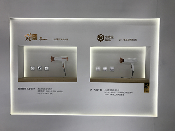月立是一家國際知名的電吹風品牌,在AWE展臺展出了旗下的眾多電吹風產品,其中,具有革新意義的HD-060系列智能觸屏電吹風吸引了眾多觀眾駐足體驗,這款電吹風獲得了包括金麥獎在內的多項大獎,采用開創性的ca-pacitive touch screen多點觸控技術,觸摸啟動,離手即停,負離子護發,均衡速干。