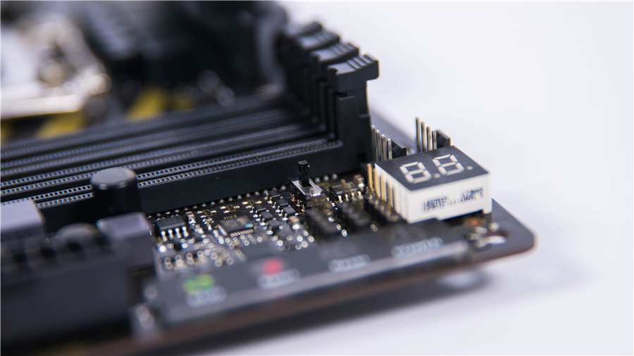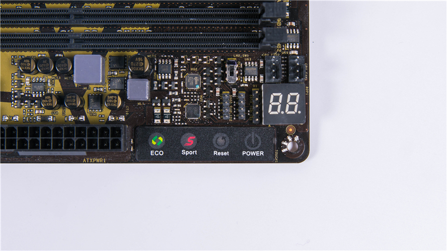 主板右上角集成了觸摸控制板和BIOS開機自檢代碼指示器。前者可以直接觸碰啟動重啟,后者配合附帶的說明書可以了解主板大部分的工作狀況,對于玩家來說是非常方便友好的設計。