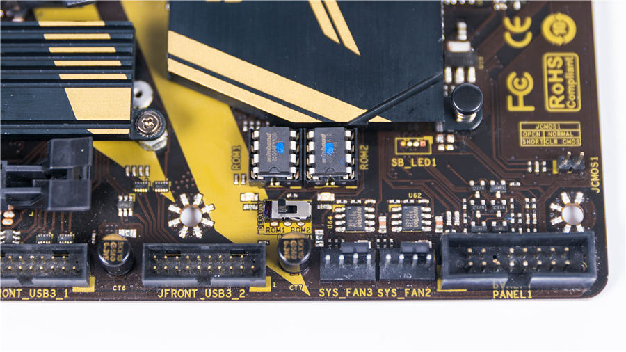 Z370GT6還配置有雙BIOS切換功能。當通過BIOS切換開關切換ROM1/ROM2后,會有醒目的LED燈提示當前ROM使用情況。雙BIOS設計大大方便了玩家進行超頻,主板整體可玩性非常高。