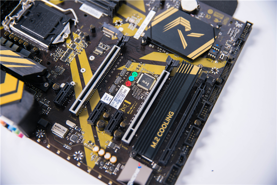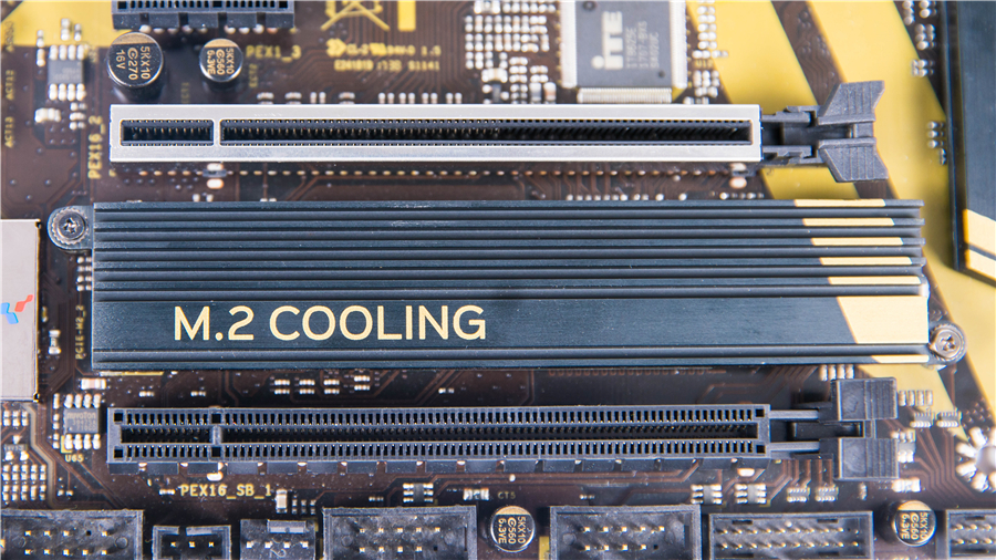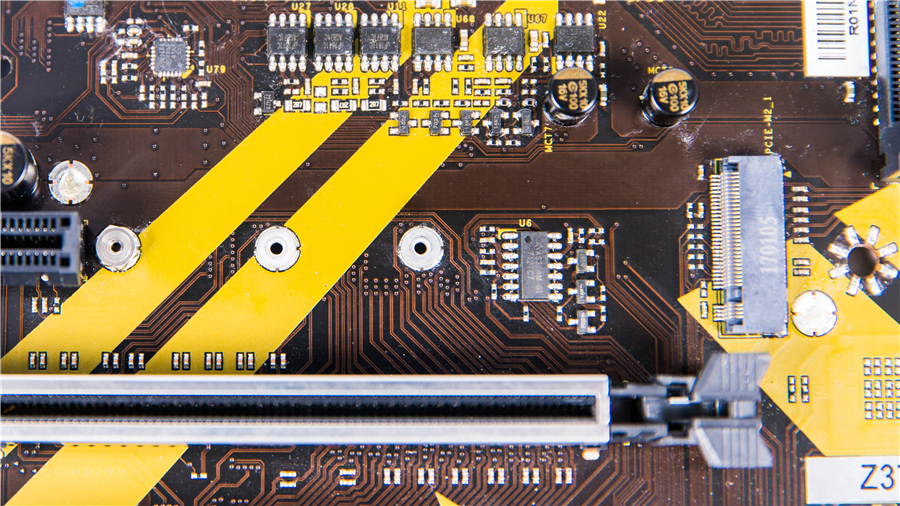 Z370GT6配備有雙M.2 SSD接口,其中位于下方的配有專門的散熱裝甲,最大支持M.2 Type 22110 SSD模塊,自帶了散熱硅膠。上方接口最大支持M.2 Type 2280SSD模塊。
